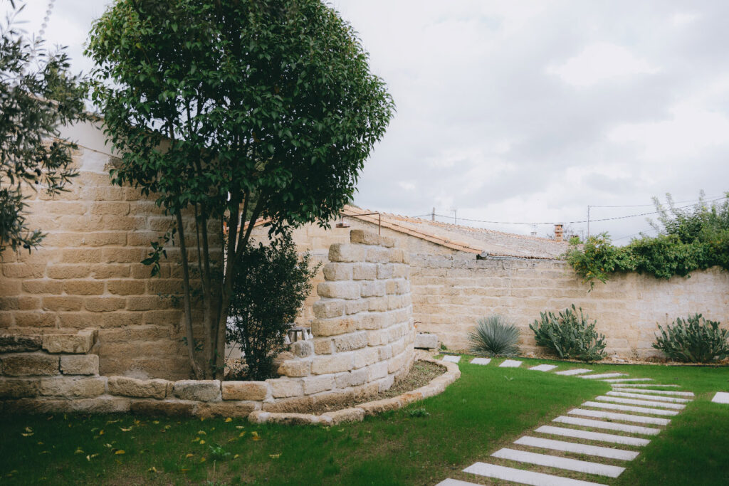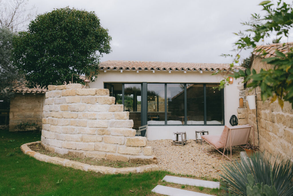 La pierre issue de la démolition a été réemployée pour créer un mur extérieur arrondi intégrant une douche d’été.