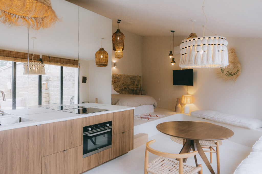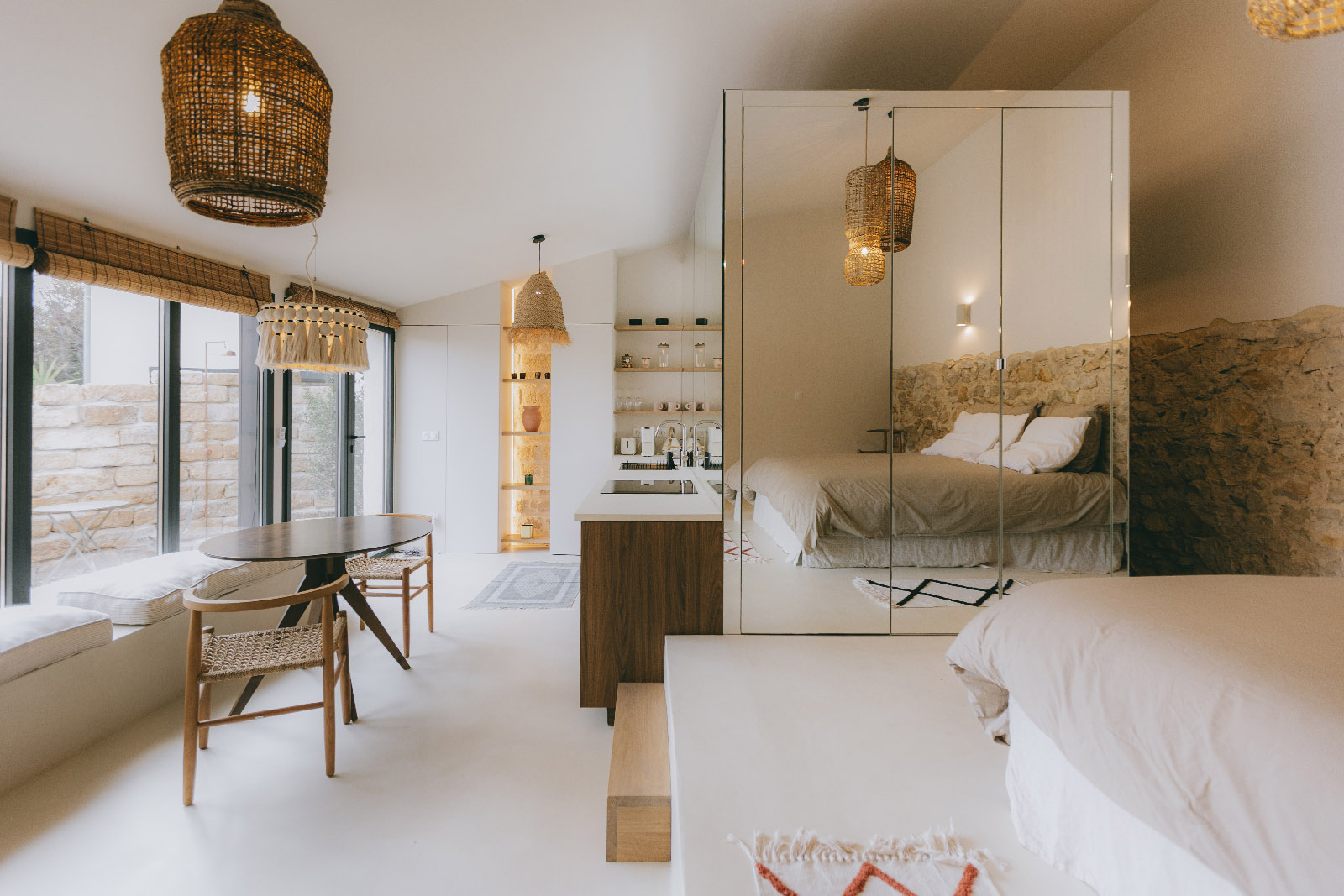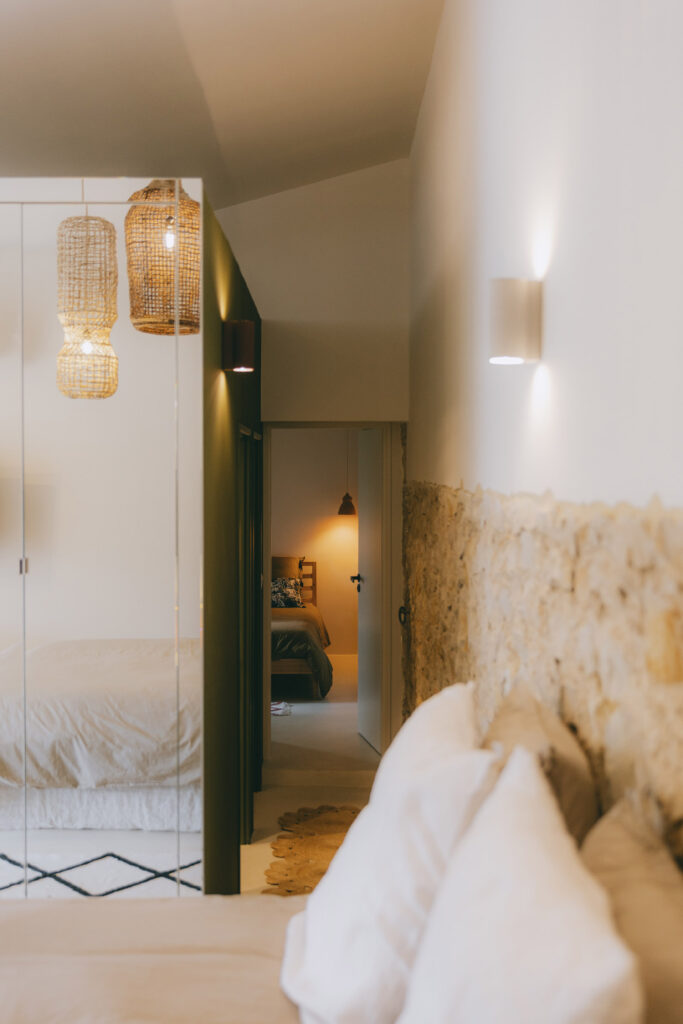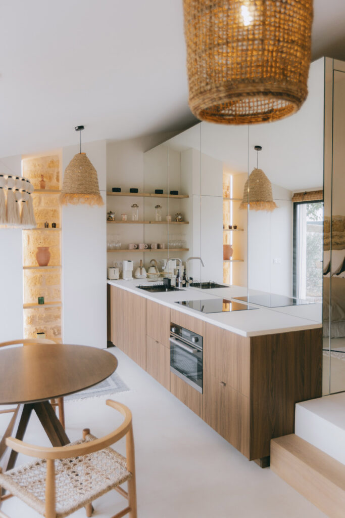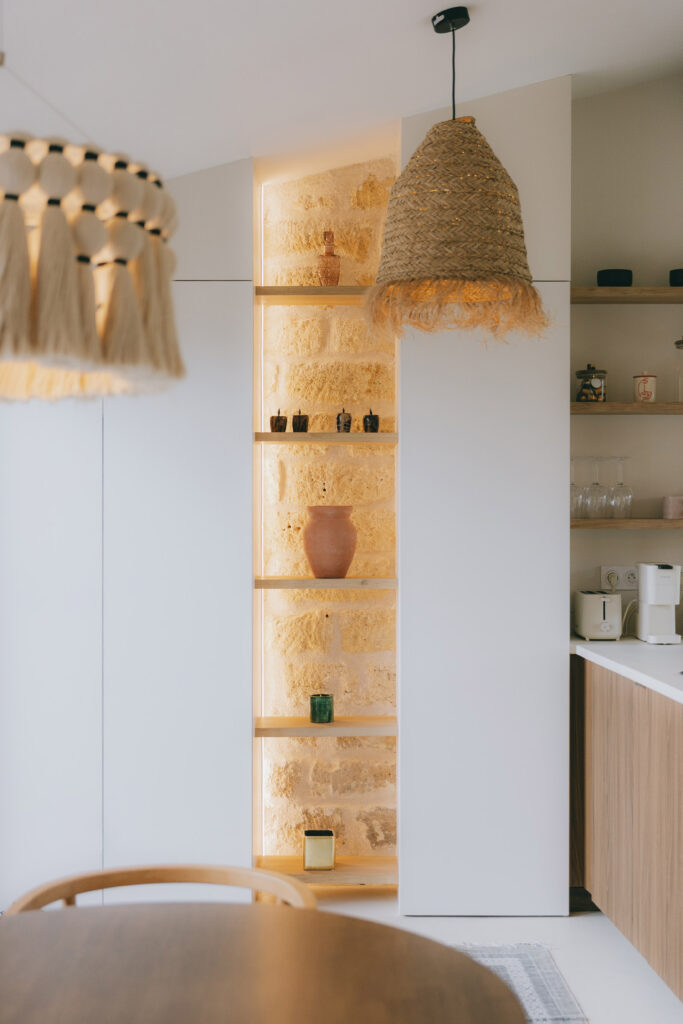 Des habillages en menuiserie sur mesure encadrent la pierre apparente, révélant la matière sans intervention intrusive.