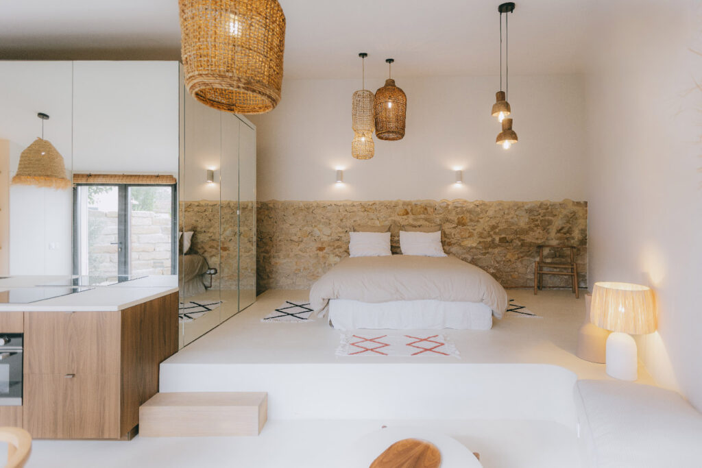 Les voûtes en pierre dialoguent avec des éléments contemporains sobres, intégrés avec retenue.