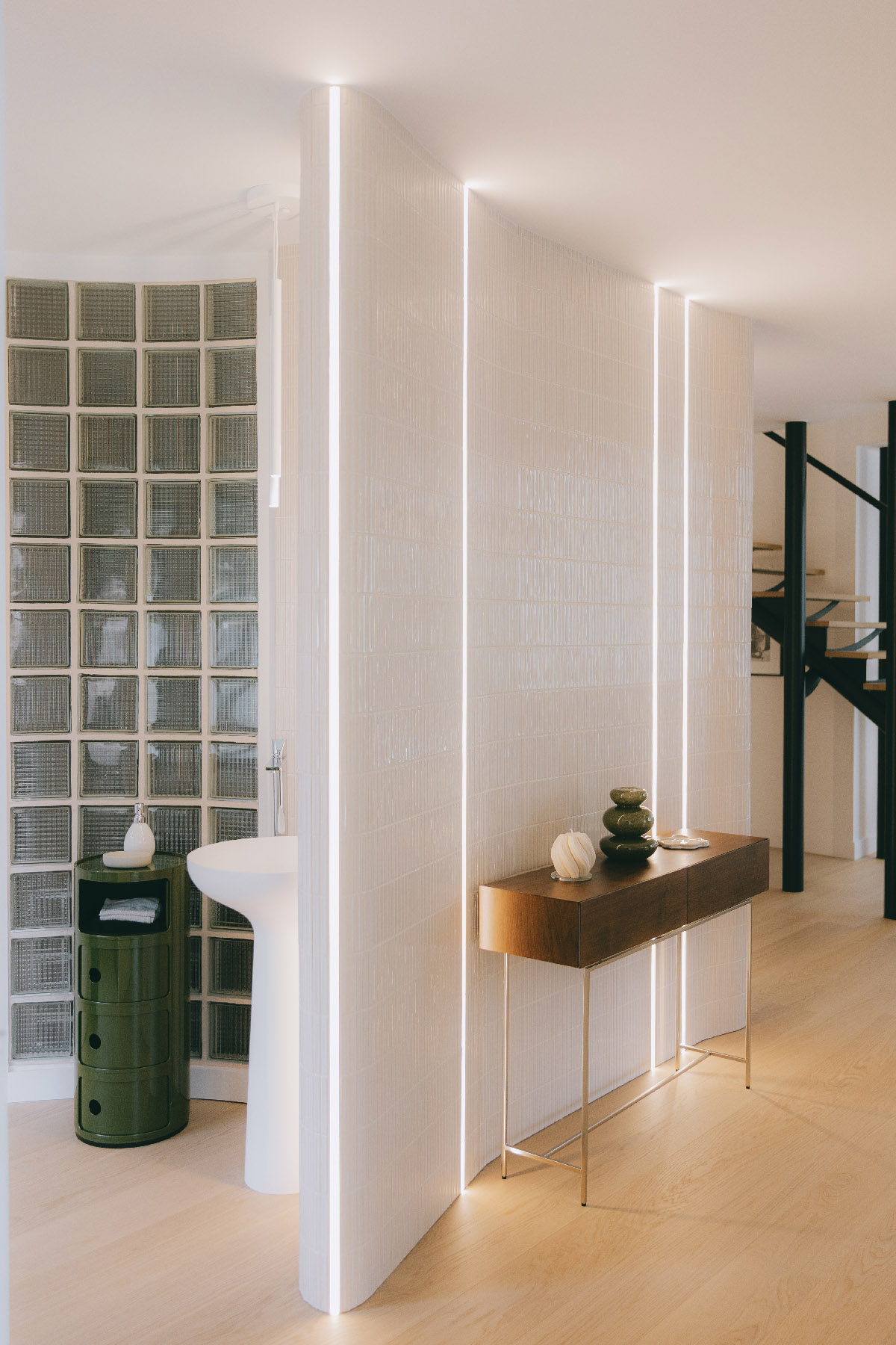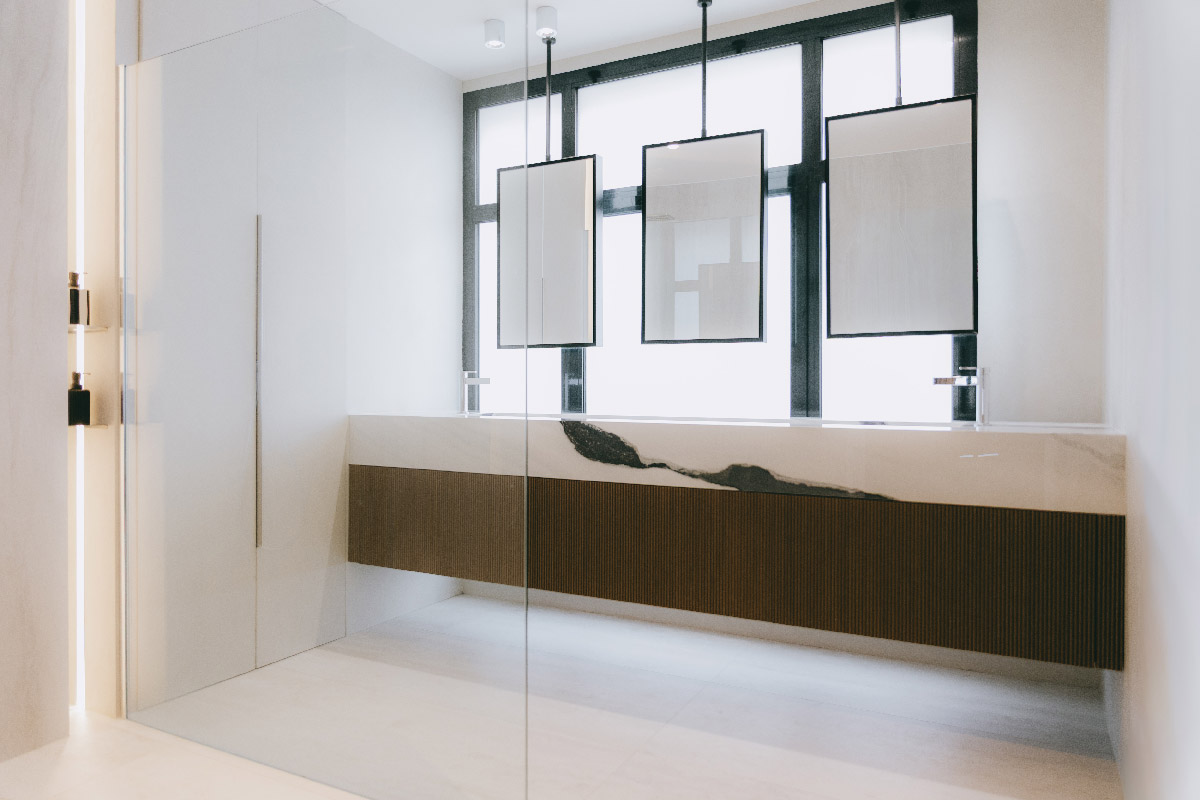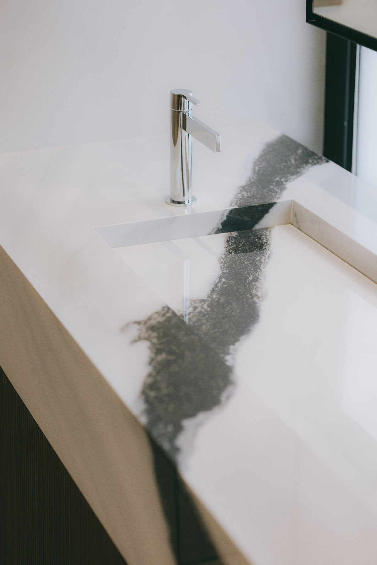 Vasque réalisée en carrelage marbre grand format, portée exclusivement par les murs latéraux, sans reprise au sol.