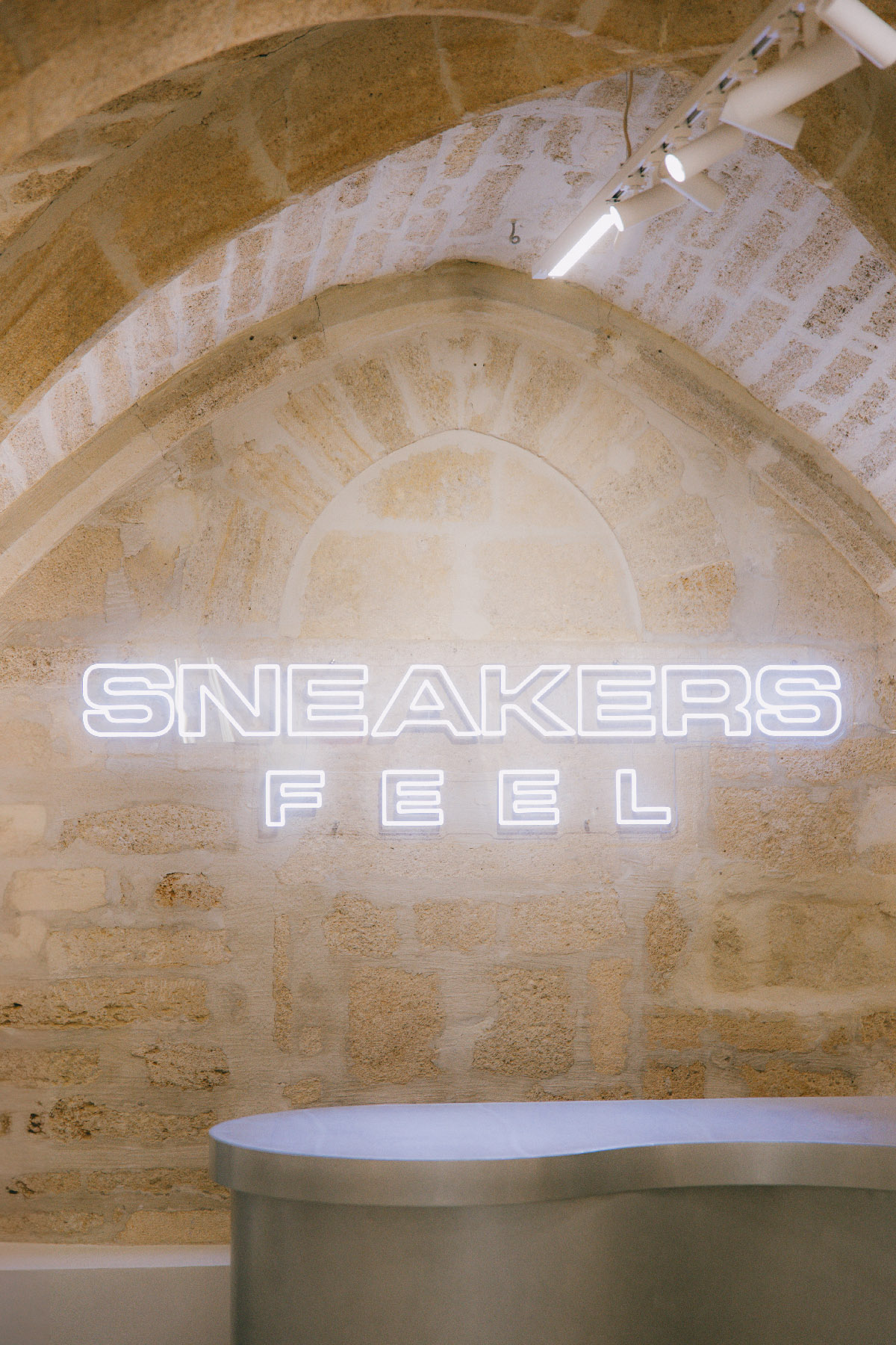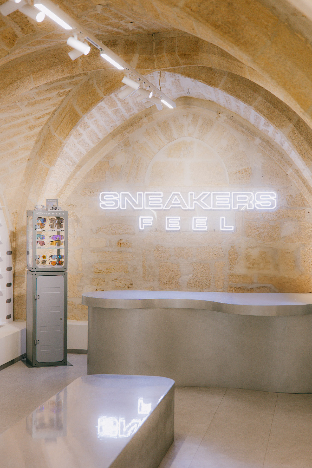 Les voûtes en pierre dialoguent avec des éléments contemporains sobres, intégrés avec retenue.
